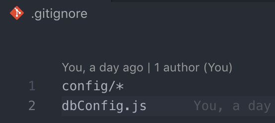 1번 라인은 config 디렉토리 및 모든 파일을 제외한다는 뜻이고, 2번 라인은 dbconfig.js라는 파일을 제외한다는 뜻이다. 둘 중 하나만 적용해도 기능은 같다.