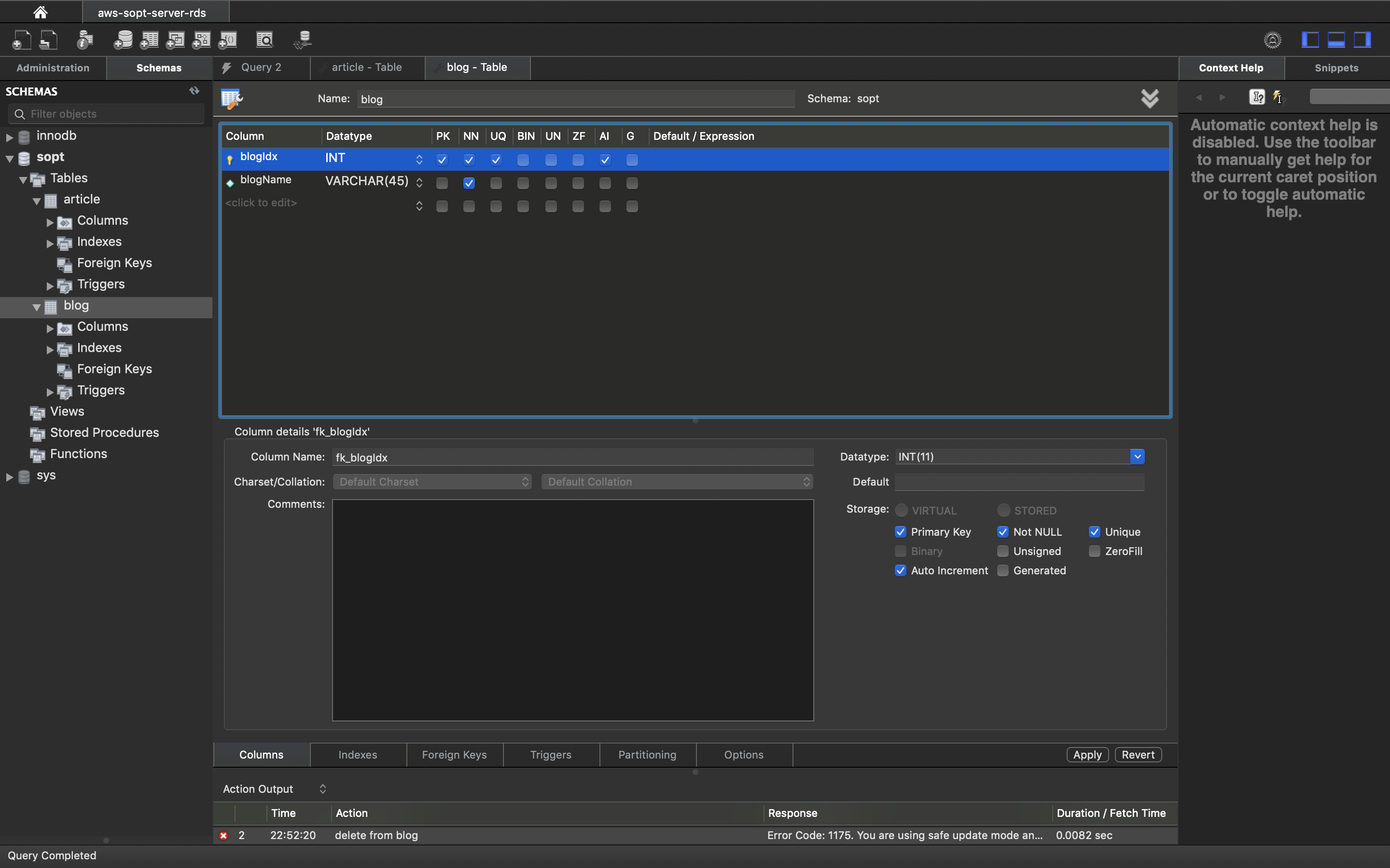 blogIdx 값은 blog가 생길 때 마다 자동으로 값이 올라가도록 Auto Increment로 설정한다.