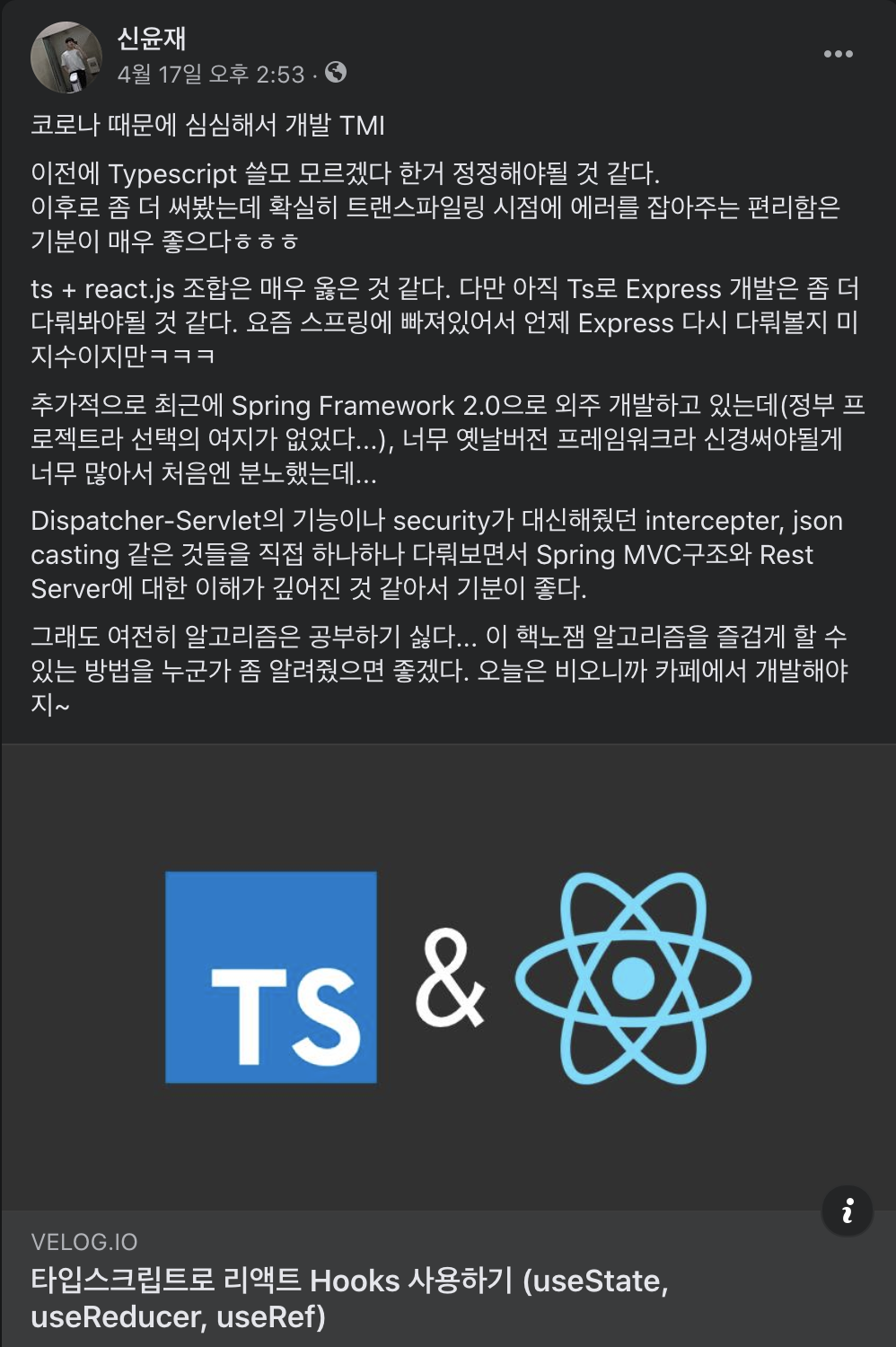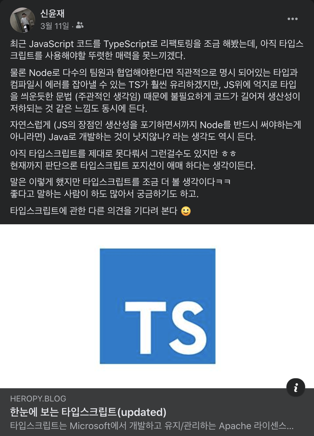 저는 요즘 Typescript의 매력에 빠져있습니다. 3월 11일에 페이스북에 타입스크립트 왜 쓰는지 모르겠다고 독설을 늘여놓았다가 1달 만에 우디르급 태세 전환을 했거든요ㅋㅋㅋ 밑에 이미지에서도 TMI로 구구절절 언급하고 있지만, JS의 가벼움을 그대로 가지면서도 트랜스파일링 시점에 에러를 잡아내 주는 이 녀석은 정말 물건입니다. bbb
