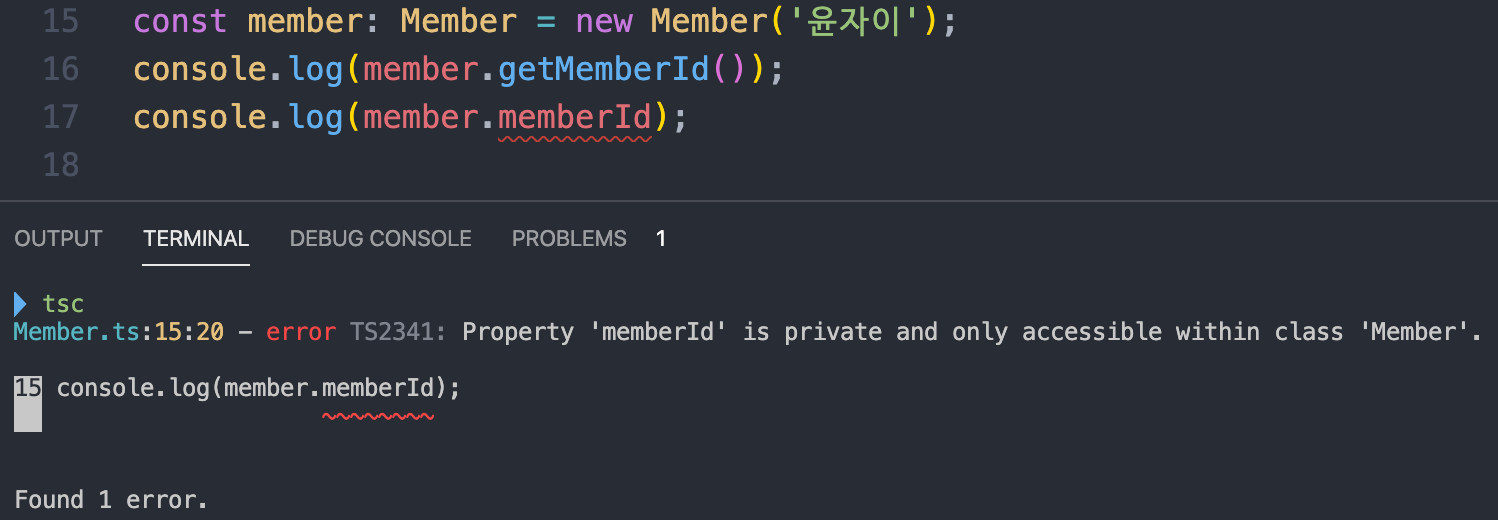 그런데 타입스크립트는 당당하게 error라며 memberId라는 프로퍼티는 private으로 선언되어 있으므로 접근할 수 없다고 빨간 줄까지 그어가며 에러라고 경고합니다.