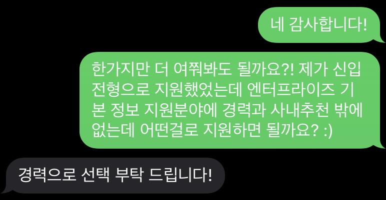최종 합격 연락은 거의 3주가 걸렸던 1차 면접과는 달리 바로 다음 날 결과를 받을 수 있었다. 전혀 생각도 안 하고 있던 중에 받은 결과라 매우 놀랐던 터라, 며칠 시간이 흐른 지금도 아직 실감이 잘 나지 않는다ㅎㅎ.