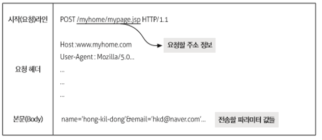기본적으로http메서드와 접근할 주소 정보 그리고 서버에 전달할 데이터인 form parameter로 구성되어 있다. 이정 대표적인 것이 get메서드와 post메서드이다.