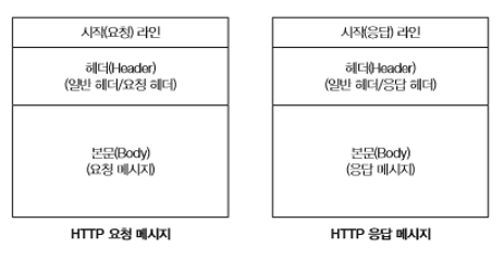 이러한 모델을 서버 / 클라이언트 모델이라고 한다. 클라이언트에서 요청(request)를 보내면 서버는 요청을 처리해서 응답(response)한다. 요청과 응답 메세지의 형태는 아래와 같다.