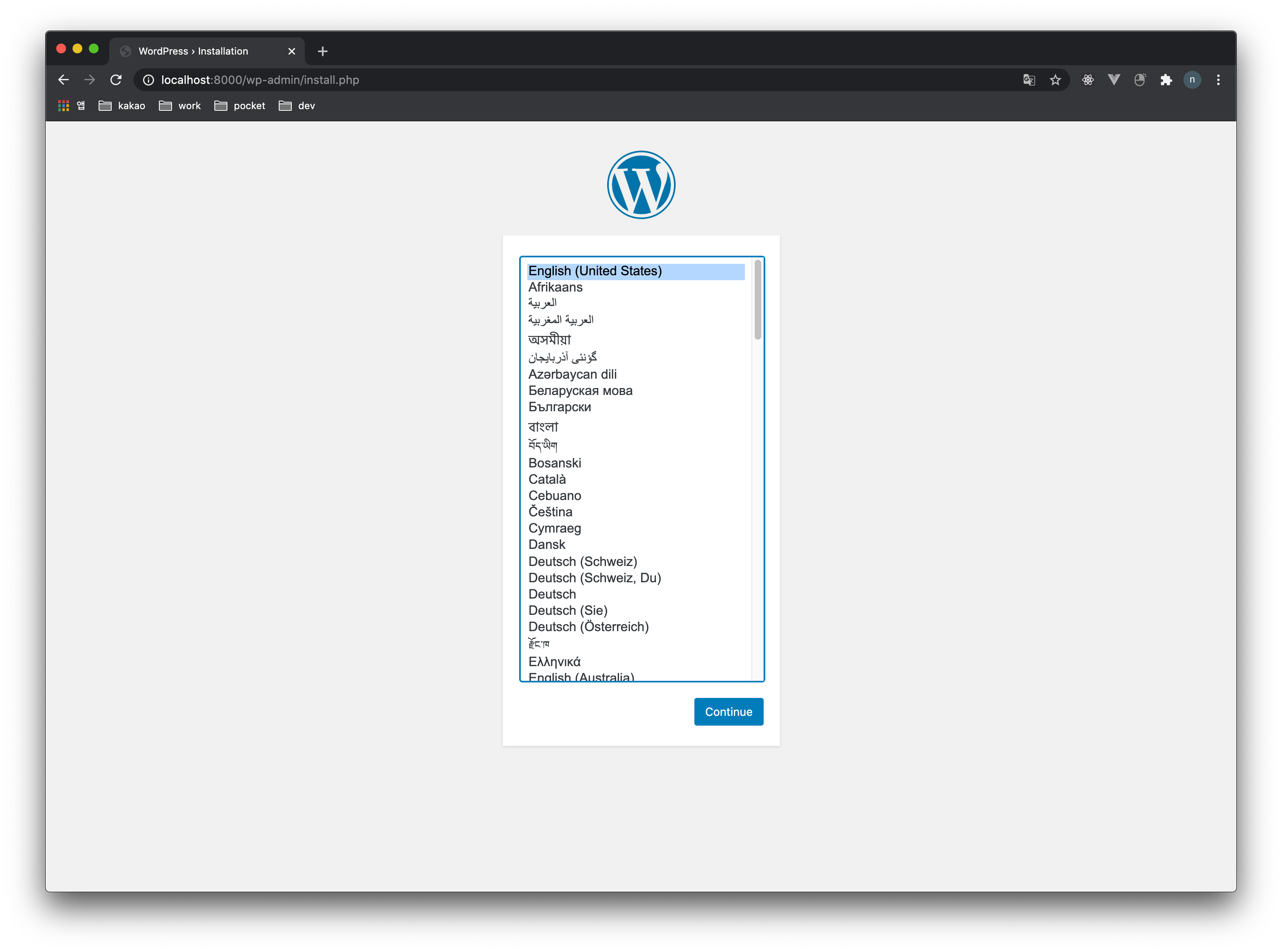 명령어를 입력한 다음 터미널에서 실행 명령어를 입력하면 wordpress 컨테이너와 mysql 컨테이너가 함께 올라가는 것을 확인하실 수 있습니다. 또한 localhost:8000 포트로 접속하면 wordpress 화면을 확인할 수 있습니다.