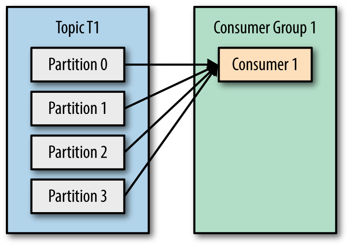 컨슈머 그룹이라는 기능으로 인해 간단하게 컨슈머를 추가할 수 있습니다. 하지만 이미지처럼 4개의 컨슈머를 추가했음에도 프로듀서가 보내는 메시지보다 컨슈머가 가져가는 메시지의 양이 적다면 어떻게 해야 할까요? 단순히 컨슈머의 수를 늘리면 된다고 생각할 수 있지만, 토픽의 파티션에는 하나의 컨슈머만 연결할 수 있기 때문에 추가한 새로운 컨슈머는 대기상태에 놓이게 됩니다. 따라서 토픽의 파티션 수와 동일하게 컨슈머 수를 늘렸음에도 프로듀서가 보내는 메시지의 속도를 따라가지 못한다면 컨슈머만 추가하는 것이 아니라, 토픽의 파티션과 컨슈머를 같이 늘려줘야 합니다.
