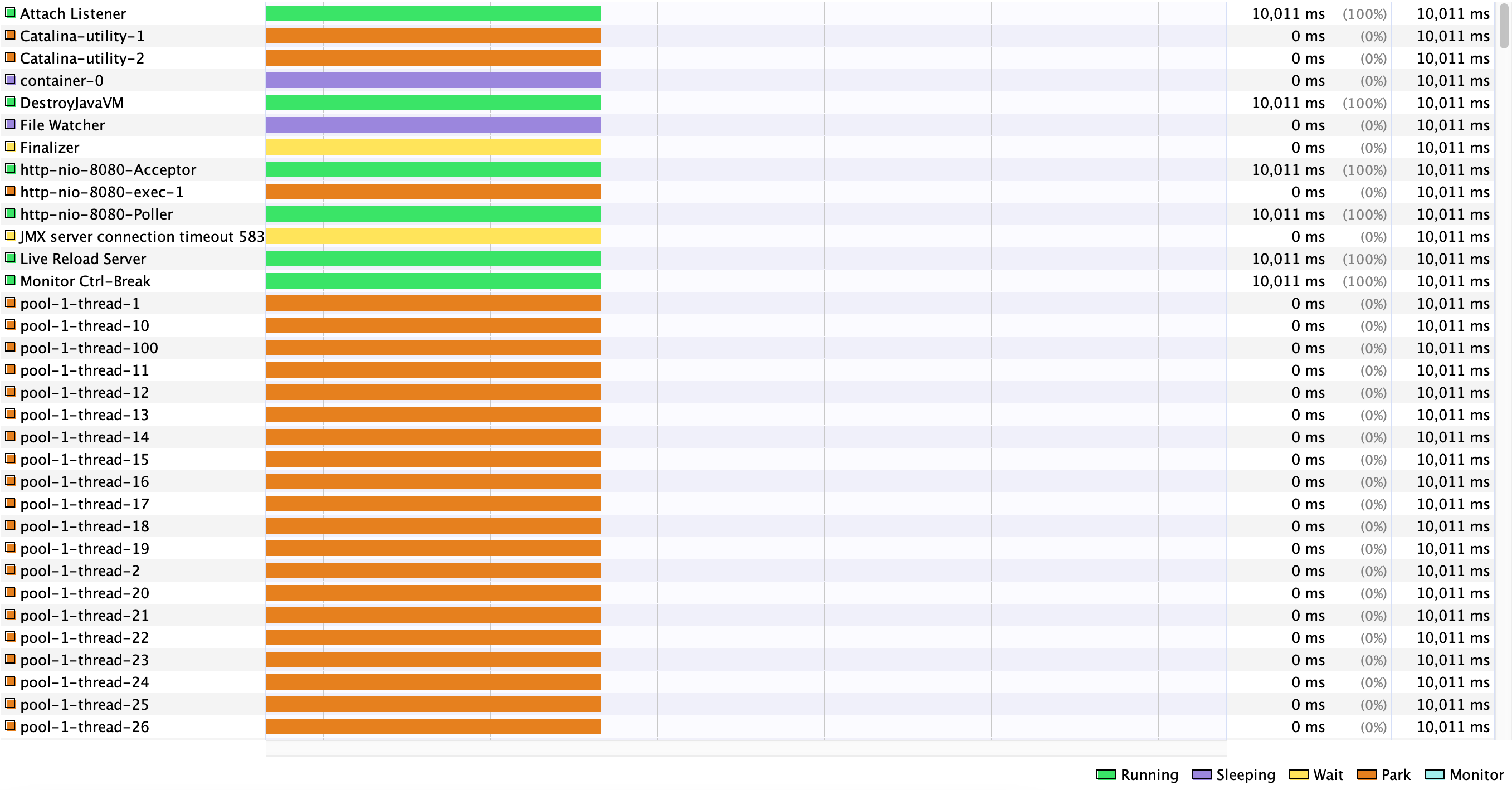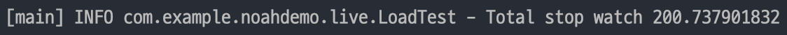 부하 테스트시 thread 상태를 확인해보면 의도대로 servlet thread (http-nio-exec-1)는 1개만 생성된 것을 알 수 있고, background thread로 task를 처리한 것을 알 수 있습니다. 그렇다면 수행 시간은 어떻게 됐을까요?