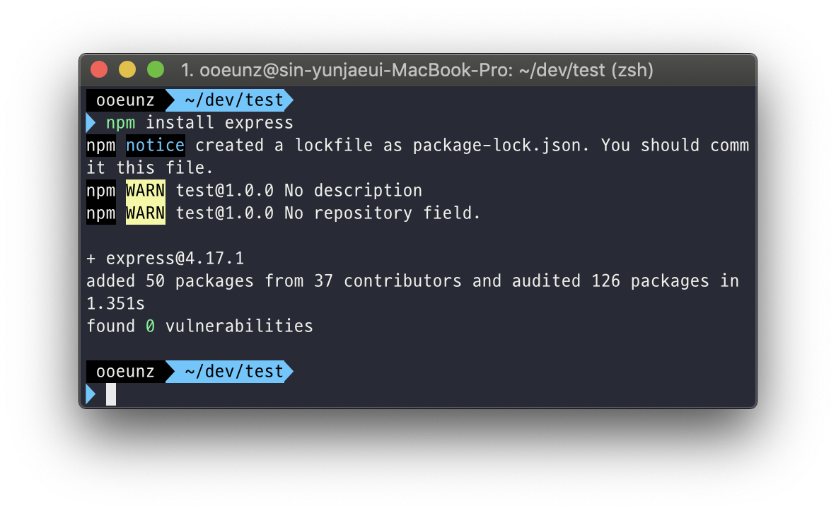 다음으로는 npm패키지를 설치해보도록 하겠다. 프로젝트 폴더에서 다음과 같이 입력하자. 필자의 예시에서는 express패키지를 설치해보도록 하겠다.