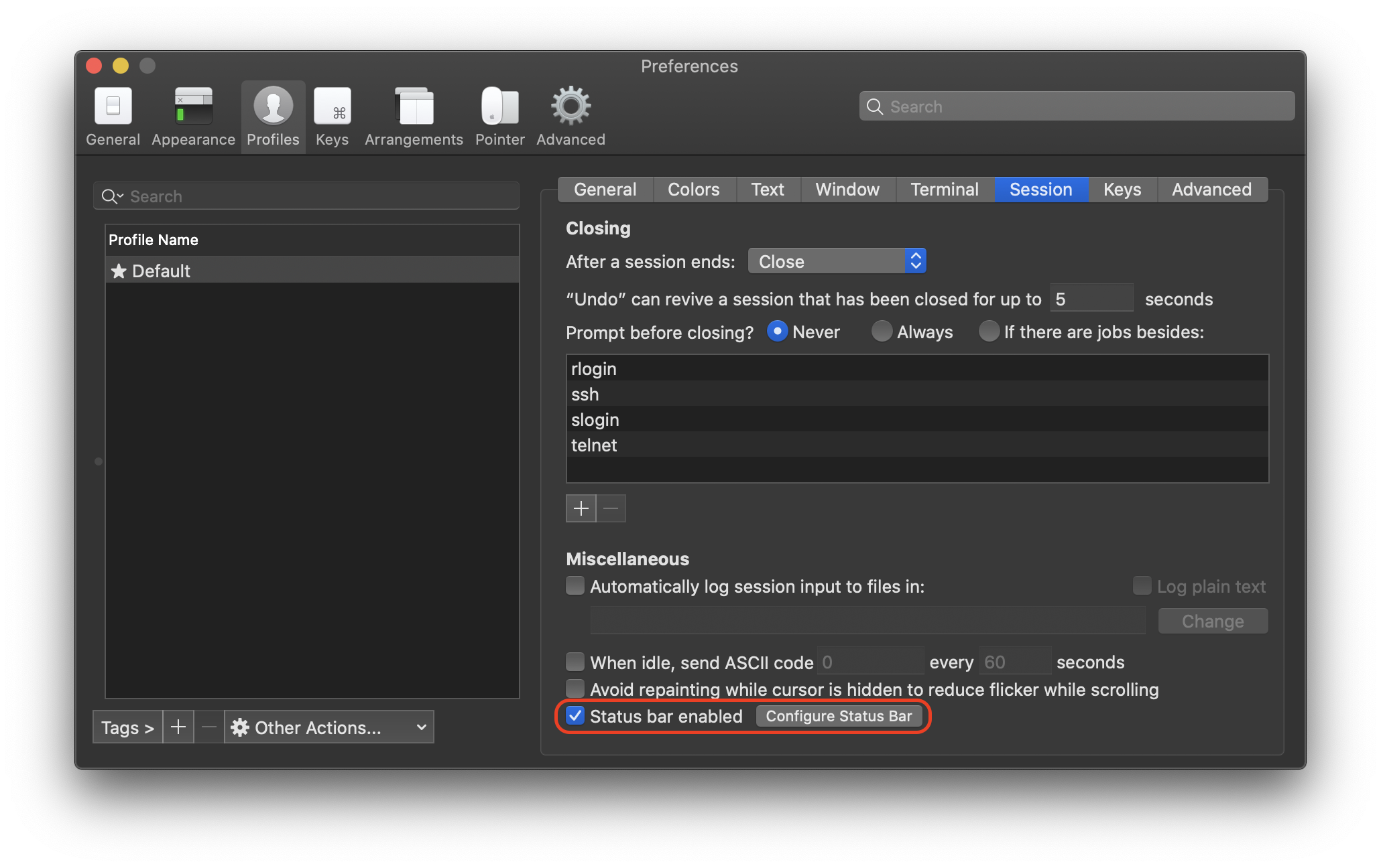 - 상태바 활성: Preferences > Profiles > Session > Status bar enabled