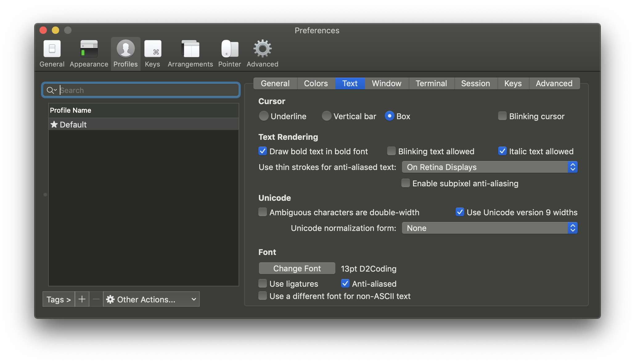 그리고 iTerm preference에서 이번엔 Text 탭으로 들어가서 font를 방금 다운로드한 D2 font로 변경해줍니다.