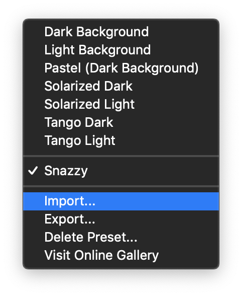 그리고 우측 하단에 color presets를 누른 후 import를 선택하여서 방금 전에 다운받은 snazzy 테마를 설정해줍니다.