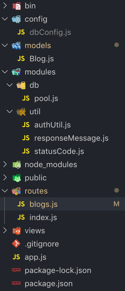 - modules > db : routes와 기능을 분리하기 위해 만들어진 디렉토리이다. dbConfig.js에 있는 정보를 사용하여 database를 조작하기 위한 코드들이 구현되어 있다.