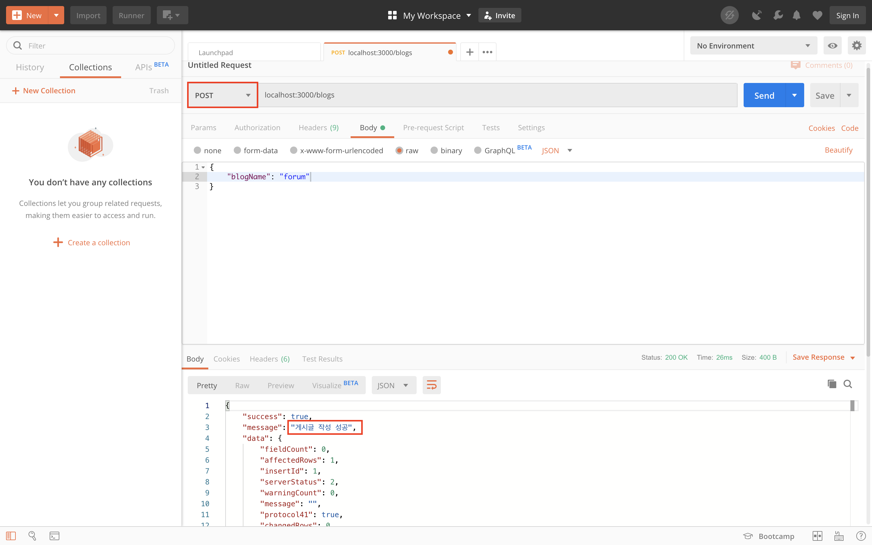 - 24번 ~ 28번: if문에서 error가 걸리지 않았다면 code와 json에 성공에 관한 값들을 넣어준다.