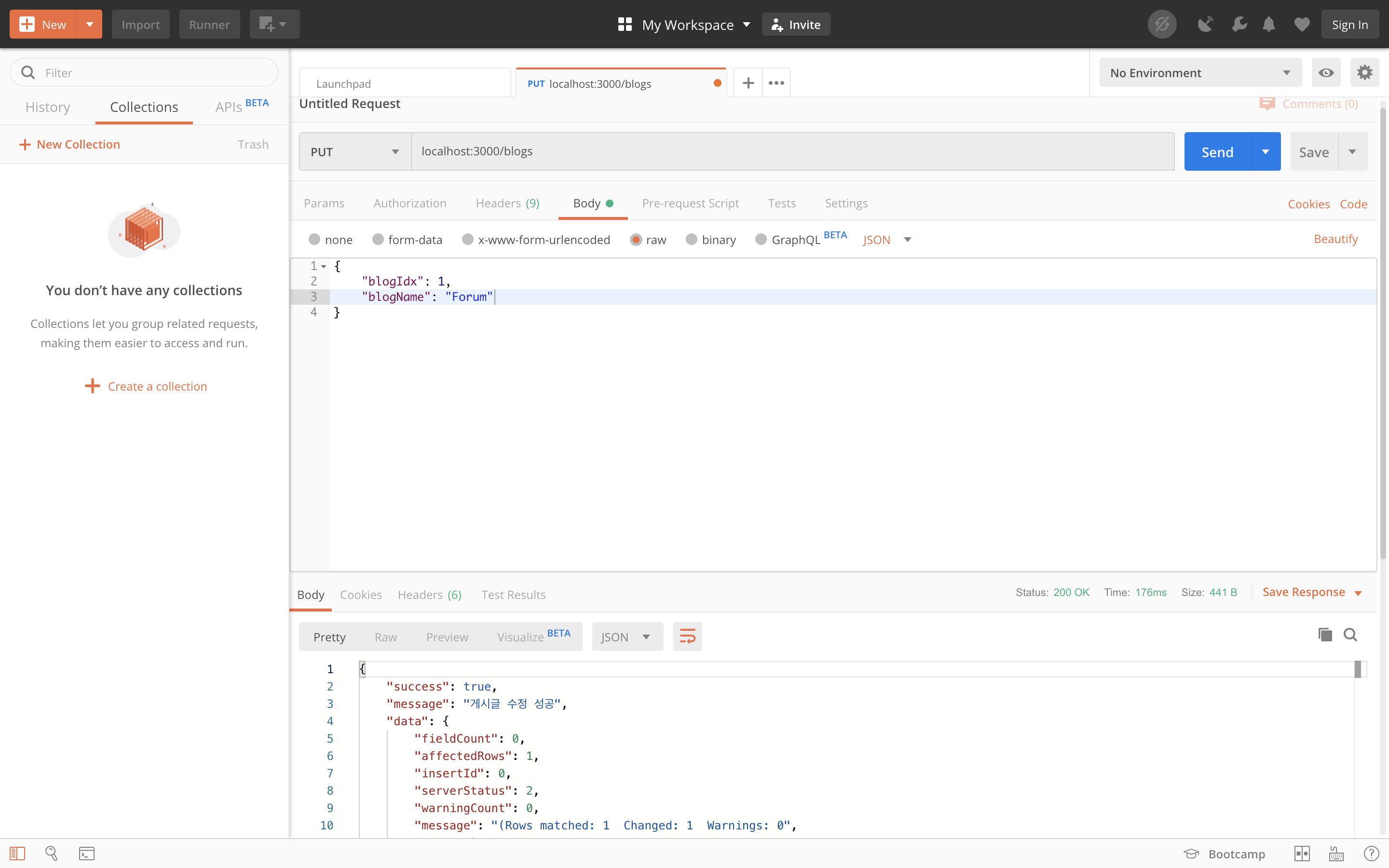 node server를 동작 시킨 후에 postman으로 아래와 같이 CRUD가 잘 동작하는지 확인할 수 있다.