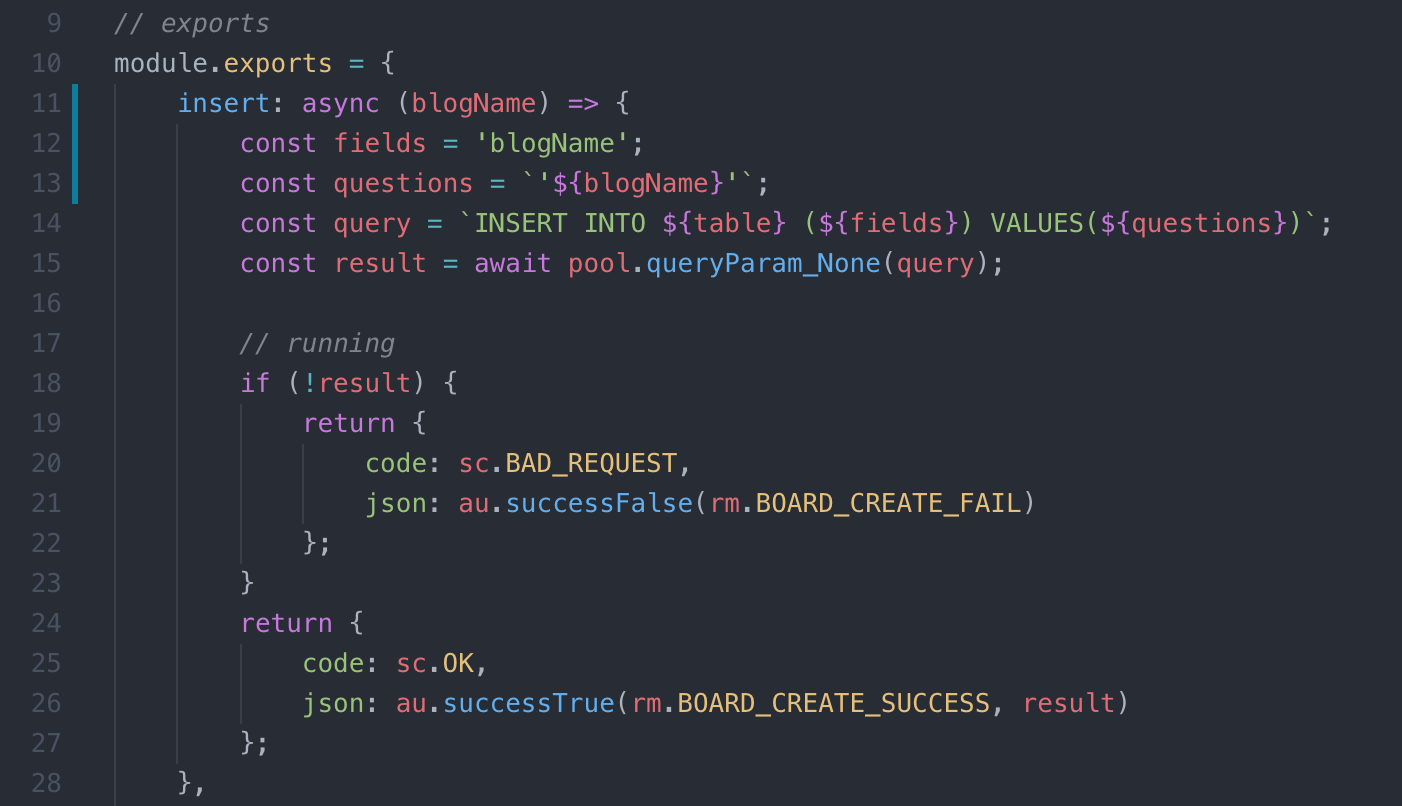 20번: model에 정의했던 insert 메서드를 호출한다. 이때 await을 붙여주지 않으면 비동기적으로 처리되지 않아서 promise 객체가 return 되니 주의하자!