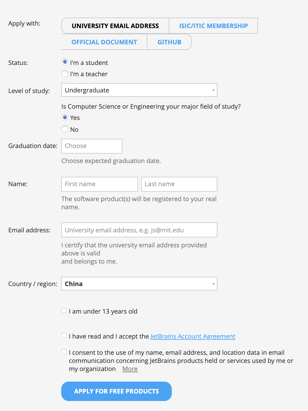 잠시 후 Jetbrains에 회원 가입하는 창이 나타나고, 회원 정보를 입력한 후에 Submit 버튼을 눌러주면 학생 인증이 완료된다.