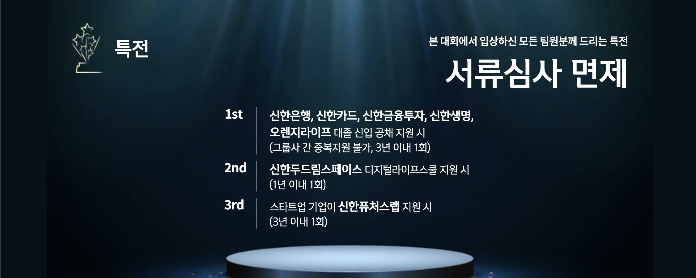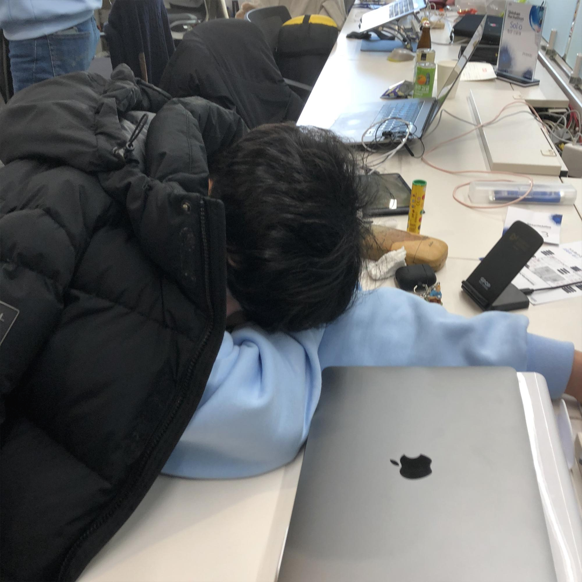 무박 3일이라는 기간 동안 진행되는 해커톤이었기 때문에 신한 그룹 측에서는 참가자들이 원하는 대로 휴식을 취할 수 있는 휴식공간을 제공해주었다. 첫째 날 밤이 되자 많은 사람들이 평소처럼 잠을 자듯 휴게실로 이동하였다. 긴 코딩 시간이 프로젝트의 완성도를 높여주는 절대적인 기준은 아니지만, 이번 해커톤을 진행하며 정말 만족스러웠던 부분 중 하나는, 우리 팀원 전원이 프로젝트에 100% 열임 했다는 것에 있었다. 우리 팀은 교대로 혹은 잠을 포기하며 개발에 열중했고, 밥 먹는 시간을 제외하고는 3일 동안 개발의 자리를 팀원 전체가 비우는 일이 단 한 번도 없었다. 우리 중 누군가는 계속해서 개발을 이어가고 있었고, 서로가 서로를 배려하였기 때문에 우리의 개발 시너지 효과는 정말 엄청났다. 처음 기획 단계에서는 '이 기능들을 정해진 시간 안에 정말 다 구현할 수 있을까?'라는 두려움이 마음속에 자리 잡고 있었다. 그만큼 개발의 난이도와 양이 많았고 그것들은 우리를 긴장하게 하는 요소였다. 하지만 3일이라는 시간이 지나고 개발 종료가 된 시점에서 우리는 스스로에게 놀랄 만큼 협업의 힘을 발휘했고, 기획했던 기능들을 온전히 마무리할 수 있었다. 때문에 우리의 열정을 응원하듯 수상자 명단에 우리 팀 이름이 포함되어 있었을 때는 해커톤에 참가한 어떤 팀보다도 기뻐할 수 있었다.