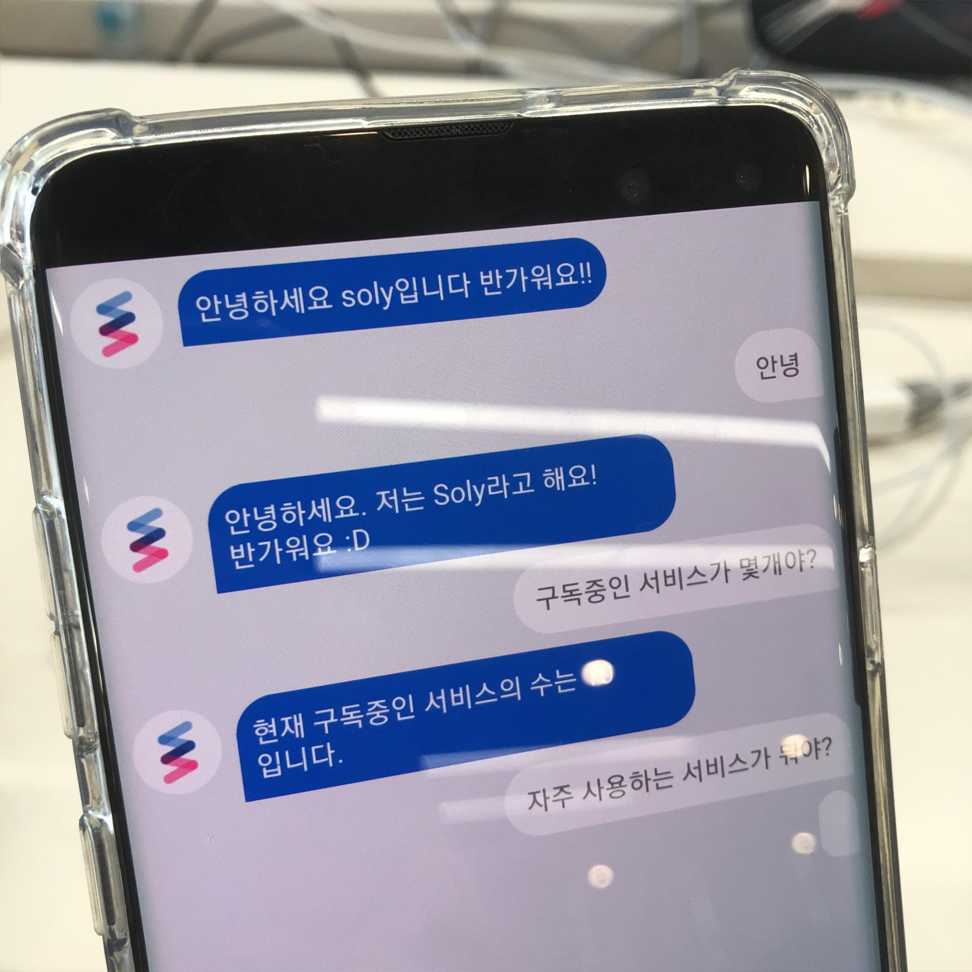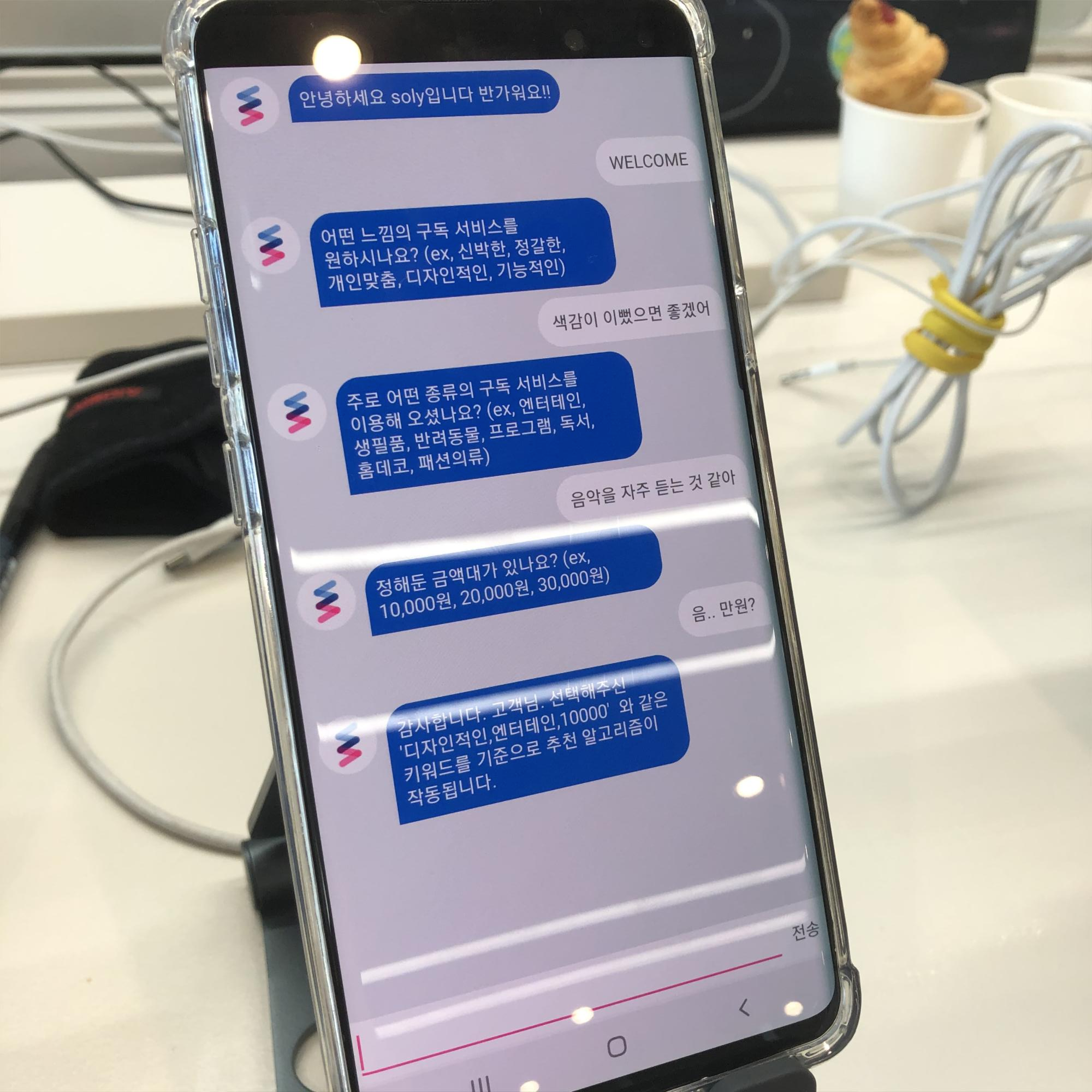 Soly라는 이름을 가진 챗봇은 사용자와의 대화에서 entity들을 추출할 수 있는 기능을 가지고 있었다. 따라서 사용자가 자유로운 발화를 통해 자신의 취향을 이야기하더라도 핵심적인 키워드들을 추출해 낼 수 있었다. 추출된 키워드들은 해당 유저의 Database로 저장되었고, 추천 알고리즘을 통해 해당 유저에게 필요한 서비스들을 메인 화면에 나타나게 하였다. 그 이외에도 자신이 구독하고 있는 서비스의 수나 결제 예정금액, 자주 사용하는 서비스 등과 같은 다른 카테고리에서 확인할 수 있는 기능들을 간편하게 대화를 통해 확인할 수 있도록 개발하였다. (내가 개발한 부분이기 때문에 유독 애착이 많이 갔다ㅠㅠ)