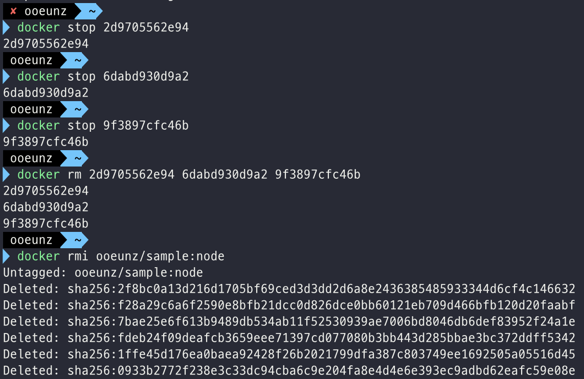 때문에 컨테이너 중지 > 컨테이너 삭제 > 이미지 삭제 순으로 이미지와 컨테이너를 지워주도록 하겠다. 대부분의 설명은 이전 포스팅에서 명령어들과 함께 상세히 포스팅하였기 때문에 여기서는 간략히 실행결과 이미지만으로 대체하도록 하겠다.