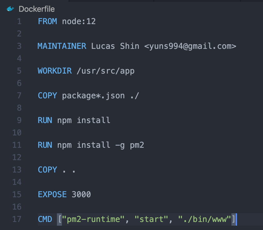 달라진 내용은 11번 라인에서 pm2를 global로 설치하는 것과, 17번 라인에서 npm start가 아니라 pm2를 runtime으로 실행시켜주는 차이이다.