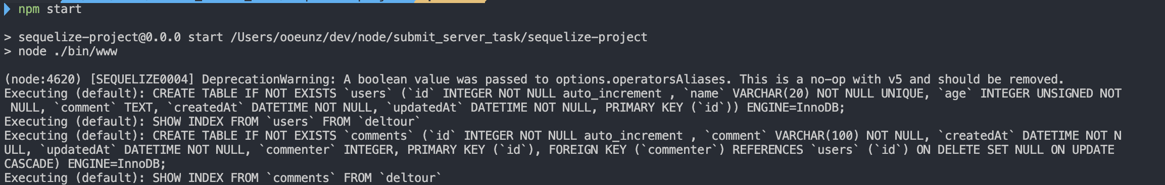 이제 Node 서버를 실행시켜보도록 하겠다. 서버를 실행시키면 시퀄라이즈가 스스로 SQL문을 실행시켜주는데, 자세히 읽어보면 IF NOT EXISTS라고 되어있는데, 만약 위에서 정의한 테이블들이 존재하지 않을 시에는 자동적으로 위의 테이블들을 생성해주게 된다.