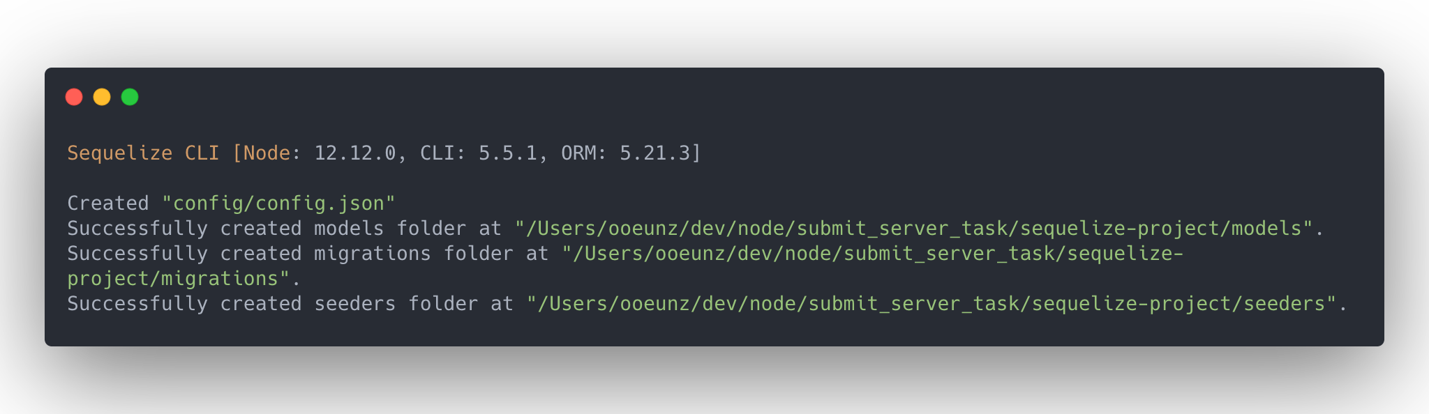 그럼 아래와 같은 명령어들이 뜨면서 config, models, migration, seedeers 디렉터리들이 생성된다.