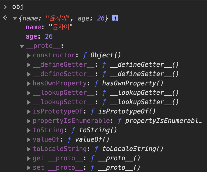 obj 객체를 까보니 아까 선언했던 프로퍼티와 다른 __proto__ 라는 프로퍼티가 존재합니다. 그리고 해당 객체 안에는 다양한 메서드와 프로퍼티들을 내장하고 있습니다.