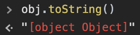 이번엔 잠시 Node.js가 아닌 크롬 개발자 도구를 사용해보도록 하겠습니다. obj라는 이름의 객체를 생성하고 toString()이라는 메서드를 호출해보겠습니다.