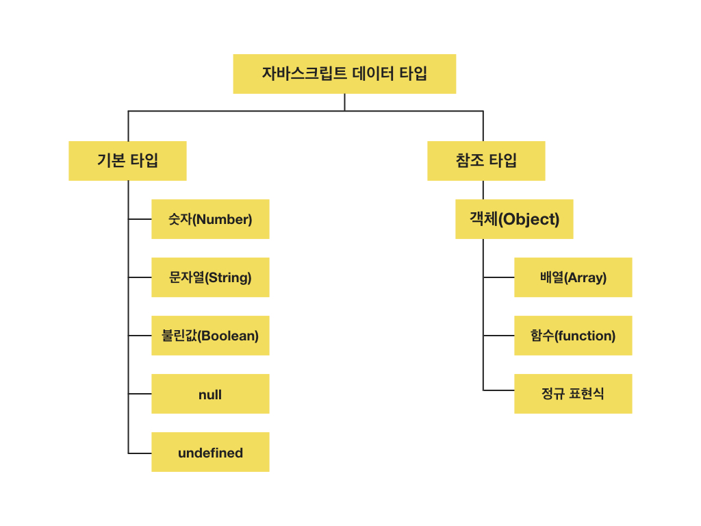 이 두 타입은 모두 자바스크립트에서 값이 비어있음을 의미합니다. 하지만 엄밀히 말하자면 null 값은 개발자가 명시적으로 값이 비어있음을 나타내는 것이고, undefined는 값이 할당되지 않은 변수입니다. 하지만 여기서 주의해야할 점이 undefined는 값이 할당되지 않은 변수라는 의미이지만, undefined 또한 하나의 타입이며 하나의 값이라는 점입니다.